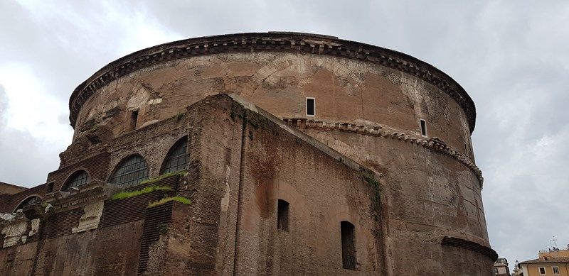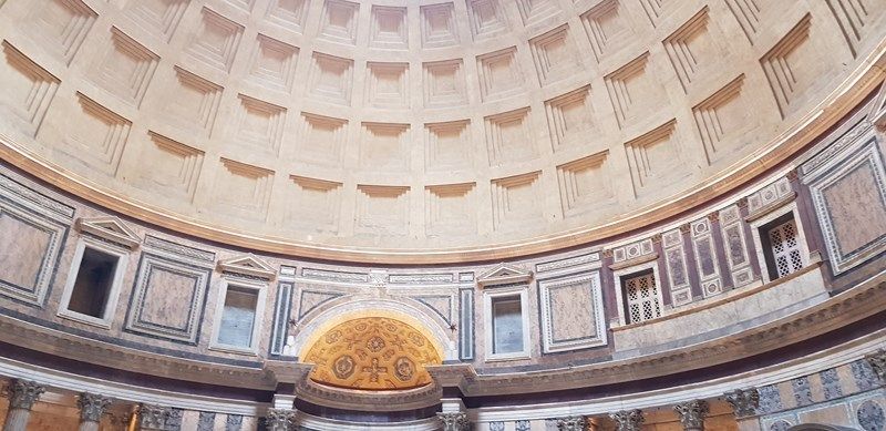 Le Panthéon supporte la plus grande coupole de toute l’Antiquité avec 150 pieds romains soit 43,30 m de diamètre à l'intérieur, qui reste la plus grande du monde en béton non armée.